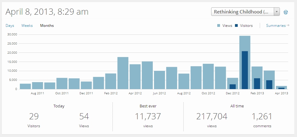Rethinking Childhood website 2010Two reasons for starting to blog were to reach a wider audience with my writing, and to have more conversations with those interested in my work. I’ve no real idea about what the page view figures mean in terms of audience – though I do know that my book No Fear has sold around 5,000 copies, so my most popular posts are reaching significantly more people than are likely to have read it. (I also know that a tumblr post by my teenage daughter – an anecdote about a star from the cult TV show Supernatural – attracted 40,000 views in 24 hours!) As the chart below shows, monthly trends for viewing figures seem to be upward, though with some peaks and troughs. Monthly page views chart